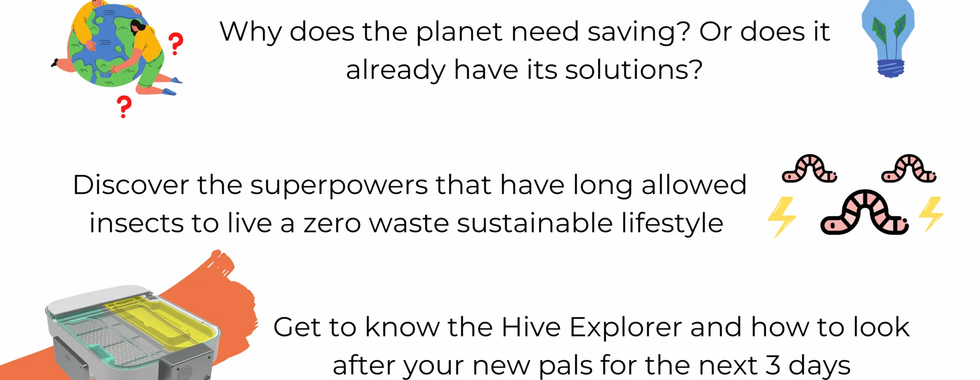 第1日 – 昆蟲拯救地球的超能力:地球為什麼需要我們的拯救?有沒有什麼方法可以改善地球現時的情況?我們的昆蟲朋友一直能與地球和諧共處,以零廢物及可持續發展的方式生活,我們能夠與昆蟲一起以這種生活方法拯救地球嗎?小學員會於此訓練營中,學到如何使用The Hive Explorer科技,於接下來的3日養殖我們的小幫手 — 麵包蟲。